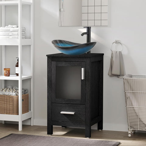 18 Inch Small Bathroom Vanity with Vessel Sink, Modern Freestanding Cabinet with Matte Glass Door, Drawer, Water-Saving Faucet & Pop-Up Drain, Black