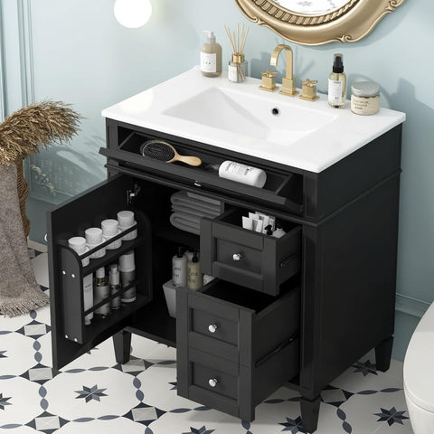 - Easy Installation – Includes labeled parts and detailed instructions for a smooth assembly process. Overall dimensions: 30"W × 18"D × 33"H. This vanity delivers generous storage and everyday practicality while enhancing the look of your bathroom.