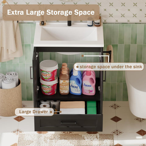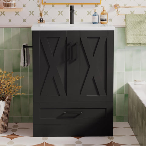 24-Inch Farmhouse Bathroom Vanity with Sink – Freestanding Wooden Cabinet with 2 Doors and 1 Drawer, Black