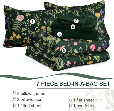 Yiran Queen Comforter Set 7 Piece, Dark Green Floral Bedding Set, Bed in a Bag Queen with Botanical Flowers Patterns, Soft Lightweight Complete Comforters with Sheets for All Season