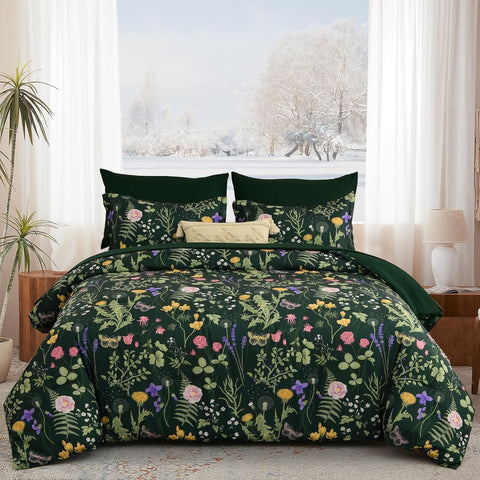 Yiran Queen Comforter Set 7 Piece, Dark Green Floral Bedding Set, Bed in a Bag Queen with Botanical Flowers Patterns