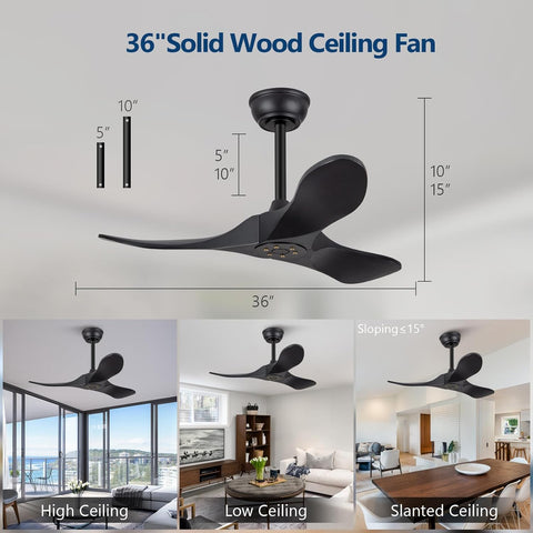 Inspired Maverick Style 36 Inch Solid Wood Black Ceiling Fan with Remote,Ceiling Fan no Light,6 Speeds,Noiseless,Reversible DC Motor,Modern Ceiling Fans without Lights for Bedroom Farmhouse Kids Room A101-B0DFTD9F71