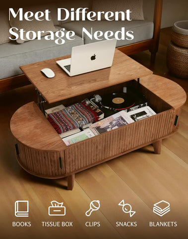 - AMPLE STORAGE CAPACITY: Unique coffee table features a spacious design with hidden compartments and open shelves; Ideal for storing books, snacks, and remotes; Keeps your living area organized without sacrificing space
