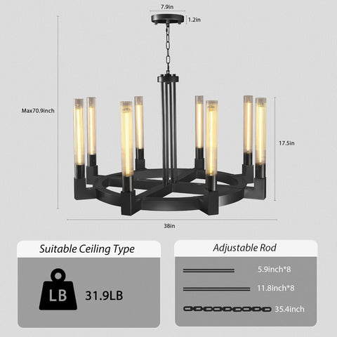 This 36 Inch round wheel chandelier is crafted with high quality pure copper, exquisite and durable, high quality pure copper finish ensures long-lasting luster and resistance to rust and corrosion; Features clear striped glass tube shade, includes 8 E26 compatible bulbs, can be used with dimmer for dimming function, softly diffuses the light and creates a cozy home atmosphere.
