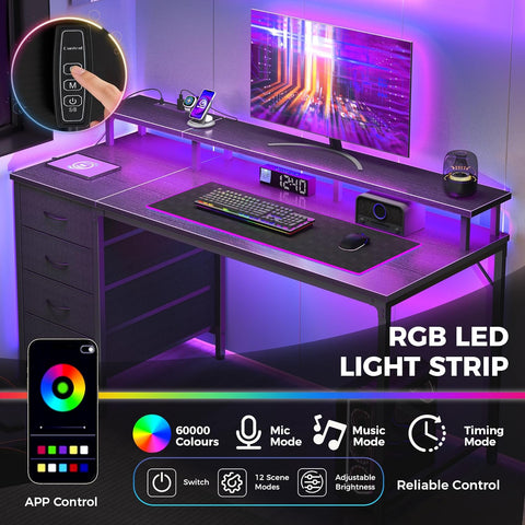 Computer Desk with 4 Drawers,4 Drawer Gaming Desk with with Power Outlets and LED Lights,Office Desk for Small Spaces