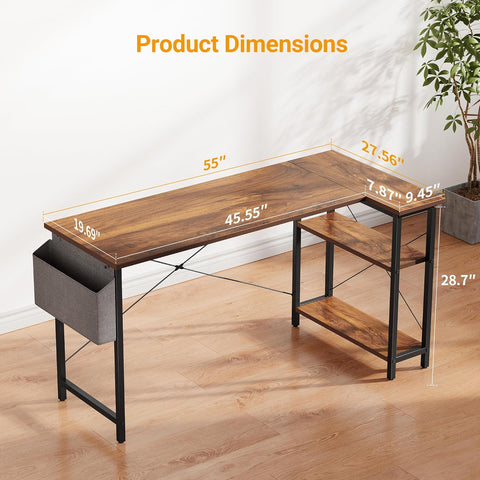 L Shaped Desk, 55" Computer Table with Reversible Storage Shelves Home Office Corner Study Writing Gaming, Brown