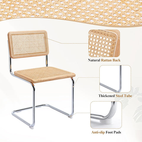 Rattan Cantilever Dining Chairs Set of 2, Boho Modern Dining Chairs with Rattan Back and Curved Steel Base for Kitchen or Living Room, Natural