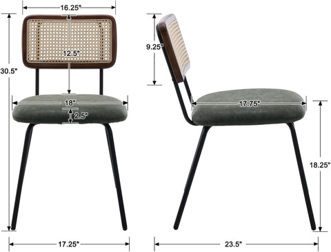 Rattan Dining Chairs Set of 2, PU Leather Upholstered Dining Chairs with Cane Back and Metal Legs for Dining Room or Living Room, Green