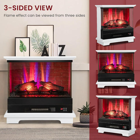 27 Inch Electric Fireplace with Mantel, 3-Sided Glass View, Wooden Surround Firebox, Freestanding Heater with 7 Flame Colors, Remote Control, Timer, Overheat Protection, 1400W, White