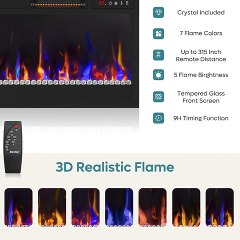 - Realistic 3D Flame Effects: Features crystal-enhanced 3D flames with 7 auto-changing color options and 5 adjustable brightness and flame-speed levels. Delivers up to 5,120 BTU of heat, warming areas up to 400 sq. ft. Temperature adjustable from 62°F to 92°F. Flames can be enjoyed with or without heat for year-round ambiance.
