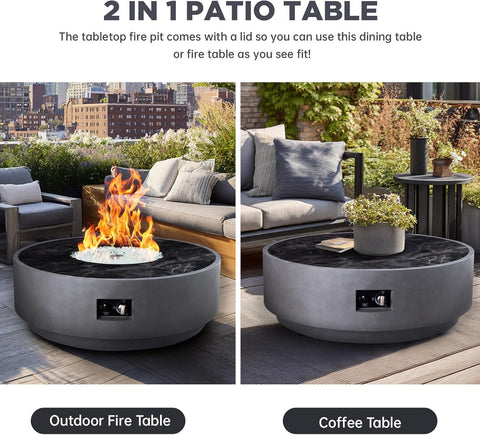 42 Inch Fire Pit Table, Outdoor Propane Fire Pit Table 2 in 1 65,000 BTU Round Gas Firepit, w/Lid, Glass Rocks, for Garden, Patio, Grey