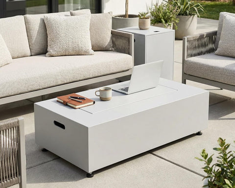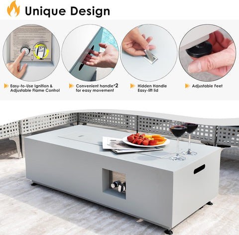 - 3-In-1 Versatility: Designed for flexibility, this fire pit supports both propane and natural gas; Enjoy it three ways—ignite the fire for warmth, add the glass wind guard for a steady flame, or place the sleek lid to transform it into a spacious coffee or dining table; The lid’s built-in pull ring ensures easy handling, while integrated hand slots on both sides allow for effortless lifting and repositioning