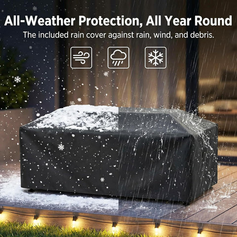 - Package Includes: Our fire tables Includes everything needed for a full outdoor setup: a fire pit table, a propane tank table compatible with a standard 20 lb propane tank (tank not included), a waterproof rain cover for protection, a glass wind guard to stabilize the flame, 8.8 lbs of blue fire glass for enhanced visual appeal, a dual fuel gas/propane conversion valve, and adjustable feet for stable placement on uneven ground