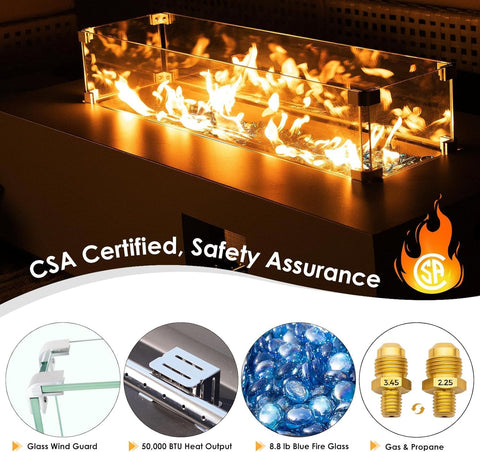- Reliable & Even Distribution: Holding CSA certification, this fireplace ensures safe use for peace of mind; Equipped with a durable stainless steel burner, rated at 50,000 BTU, it delivers ample warmth and effectively radiates heat to surrounding seating areas, ensuring everyone stays cozy, whether gathered for conversation or roasting marshmallows; The push-button spark ignition makes lighting effortless, while the chrome manual control valve allows for adjustable flame height