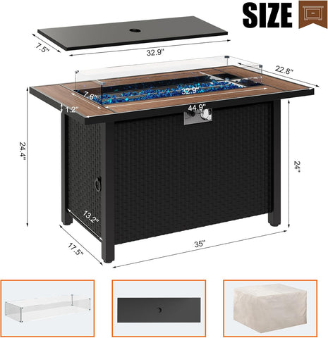 45 inch Propane Fire Pit Table, 50,000 BTU Outdoor Gas Fire Pit Table with Lid, Glass Wind Guard, Waterproof Cover, Rectangle Gas Firepit Table for