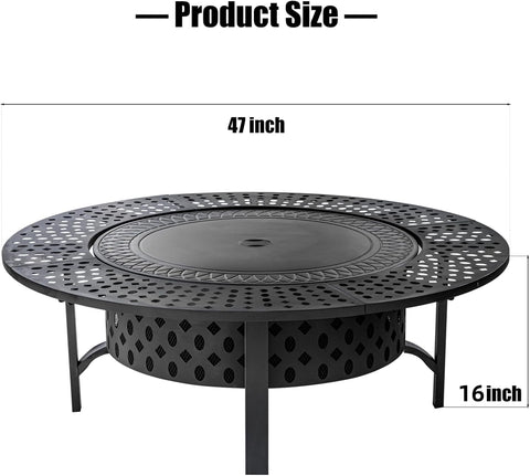 - [Beautiful & Humanized Design]OutVue fire pit table comes with 2 height-adjustable and 360° swivel grills which disassemble freely. You can barbecue, keep food warm or put pan to cook on them. The side of wood-burning fire pit is created with modern geometric cut-out design which catches firelight for creating fun shadows. The drilled design promotes airflow and keeps the fire strong. All sophisticated designs of the fire pits for outside are dedicated to the warmth and comfort for you.