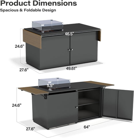 - Versatile Firepit Table - With dimensions of 64"L x 27.6"W, this outdoor fire pit table easily converts into a spacious dining table by covering it with the metal lid. The tabletop expands to 64" and folds to 46.5", providing an ideal spot to keep snacks and drinks within arm's reach.