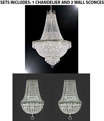 - Set of 3 - 1 French Empire Crystal Chandelier Lighting - Great for the Dining Room, Foyer, Living Room! H50" X W30" and 2 Empire Crystal Wall Sconce Lighting W 9.5" H 18" D 5"