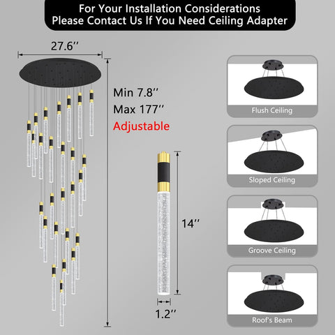 High Ceiling Crystal Chandelier - canopy width 27.6 inch, adjustable height min 7.8 inch to max 177 inch. Any voltage in the range of AC110-240V can install directly