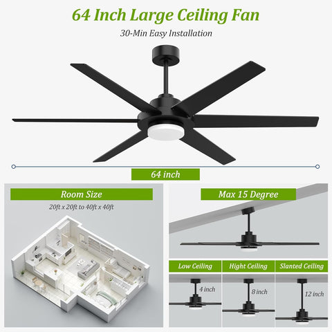 64" large ceiling fan includes 5", 10" and 24" pull-down rods, suitable for inclined 15-degree angle ceilings, creating a modern and elegant atmosphere.Stylish and modern appearance, black and integrated LED light design increase visual appeal.