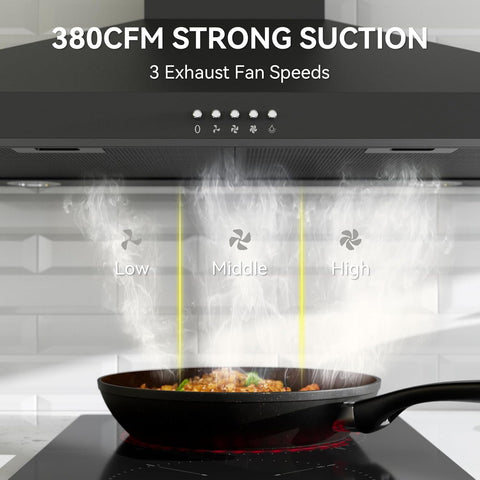 Transform your kitchen with this premium 30-inch wall mount range hood. Crafted from high-quality black stainless steel, it delivers exceptional ventilation performance while enhancing your kitchen aesthetics. This 380 CFM powerhouse effectively eliminates smoke, cooking odors, and airborne grease particles, keeping your kitchen fresh and clean.