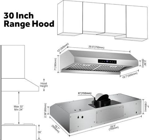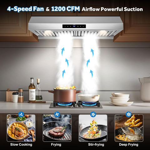 Transform your kitchen with this premium 30-inch under cabinet range hood. Crafted from high-quality stainless steel, it delivers exceptional ventilation performance while enhancing your kitchen aesthetics. This 1200 CFM powerhouse effectively eliminates smoke, cooking odors, and airborne grease particles, keeping your kitchen fresh and clean.