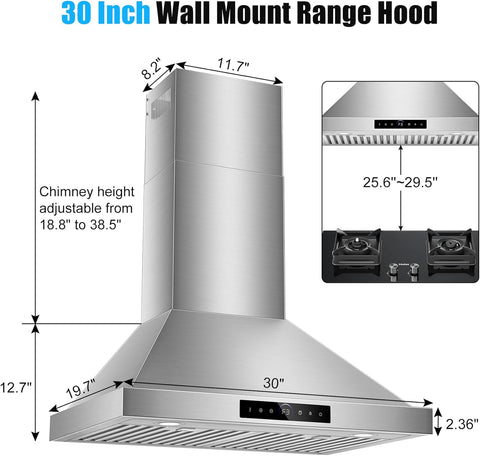 30 Inch Stainless Steel Wall Mount Range Hood 1200 CFM 4 Speed Gesture & Touch Control, LED Lights Dishwasher-Safe Baffle Filters, Ducted Timer