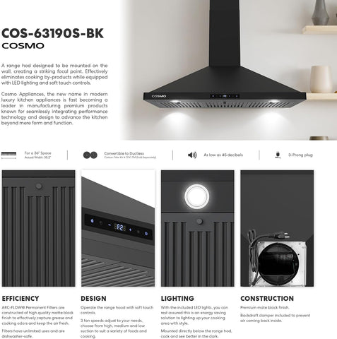 Transform your kitchen with this premium 36-inch wall mount range hood. Crafted from high-quality stainless steel, it delivers exceptional ventilation performance while enhancing your kitchen aesthetics. This 380 CFM powerhouse effectively eliminates smoke, cooking odors, and airborne grease particles, keeping your kitchen fresh and clean.