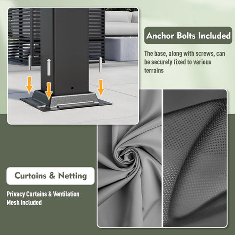 - This 10x12 FT pergola includes zippered curtains for privacy and UV protection, plus mesh screens that promote airflow while adding an extra layer of coverage. Both are detachable, easy to clean, and feature a water-resistant coating for light rain protection