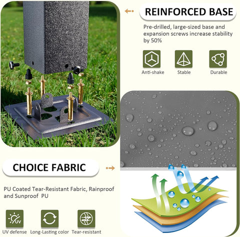 - UPF 50+ Sun Protection & Waterproof Fabric: The metal pergola employs high-density Oxford fabric with a PU coating, delivering UPF 50+ protection that blocks over 99% of harmful UV rays. Fully waterproof with sealed seams, it ensures you stay cool, dry, and safe during sudden summer showers or intense sunlight