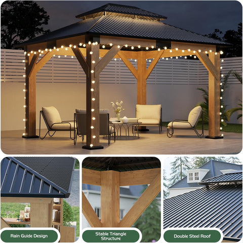 10x12 Wood Gazebo, Hardtop Gazebo with Spruce Frame and Aluminum Double Roof, Outdoor Pergola for Parties, Backyard