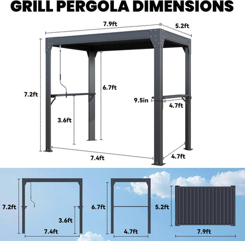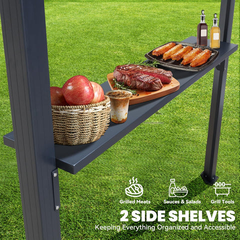 - 2 SIDE SHELVES: Reinforced with a sturdy triangular support, the 2 side shelves of the BBQ pergola offer enhanced load-bearing capacity. This design provides extra space to organize food, condiments, and grilling essentials, making your outdoor cooking experience more convenient