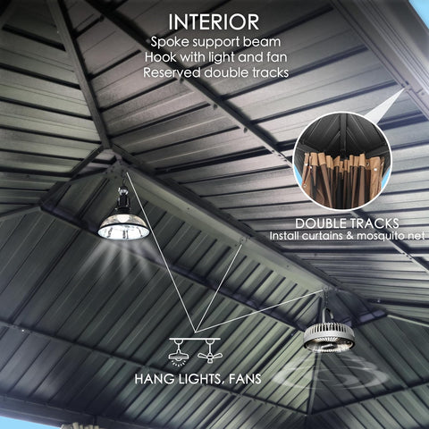 - Built-In Ceiling Hook: A reinforced ceiling hook allows you to hang outdoor lights, string lights, or a ceiling fan to elevate your relaxation and entertainment areas.