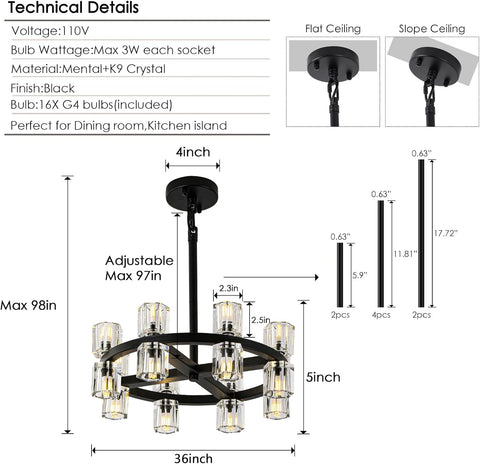 The modern black chandelier needs 36 G4 bulbs (included). It is compatible with LED, CFL, halogen lamp, and Edison bulb. Each crystal shade is 2.5in high, 2.3in in diameter, and 0.2-0.32in thick.