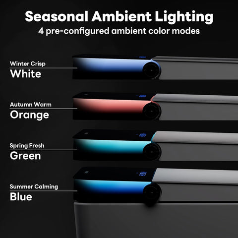 - Smart Display & Waterfall Lighting – Interactive touchscreen and control knob make adjustments effortless. Enjoy four seasonal LED hues (Green, Blue, Orange, White) with soft, diffused waterfall lighting for a spa-like ambiance and serene bathroom experience.