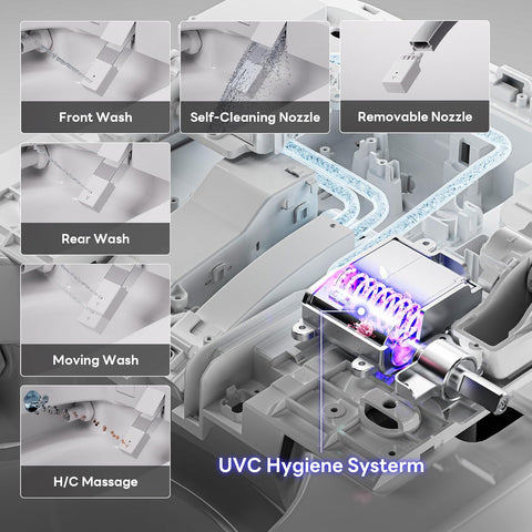 - Multiple Cleaning Modes – Warm water rear, front, and oscillating massage washes. Self-cleaning nozzle cleans automatically before and after use for a hygienic experience.