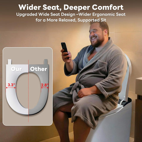 - 💺 Wide Ergonomic Seat – Extra-wide, ergonomic design offers comfort and stability for all body types. Perfect for long or short sitting sessions, providing a premium bathroom experience.