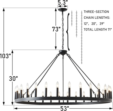 Wheel Dia: 53". Black Metal Hanging Chain: 71", Minimum/Maximum Hanging Height: 35" - 103", Canopy Diameter:5.3Ó. Flat,sloped and vaulted ceilingsare compatible. Easily customize the height of this unique wagon wheel light according to your preferences.