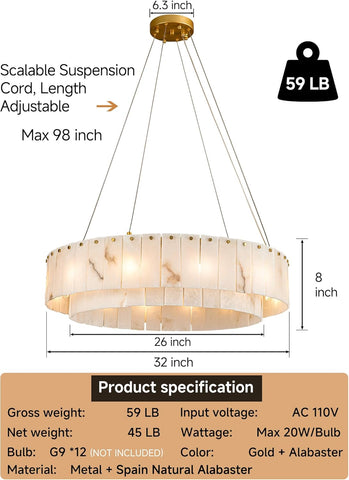 Alabaster Chandelier Round,Modern Drum Chandeliers,Spanish Marble Pendant Light Fixture for Living Room,Dining Room,Bedroom,Foyer,Kitchen Island,D32 inchs,12-Lights G9 A125-B0F5WXLSNY