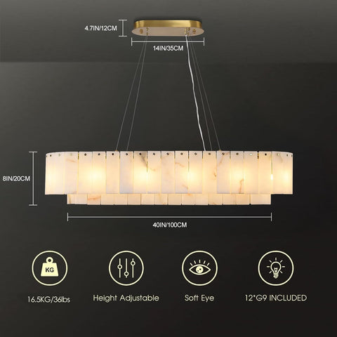 Modern alabaster chandelier size is: 40*8 inches. Weight is: 16.5 kg/36 lbs. The marble rectangle chandelier's height is adjustable and the rope length is max 78 inches. The rectangular stone living room chandelier will fit your different flat, sloped or vaulted ceilings.