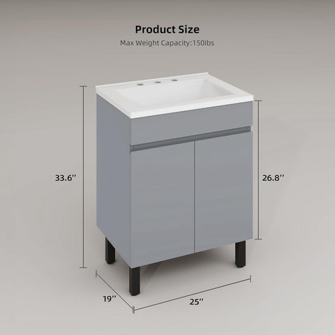 24 Inch Grey Bathroom Vanity with Undermount Sink, Modern Freestanding Sink Cabinet with Adjustable Legs, Soft-Close Double Doors & Drain