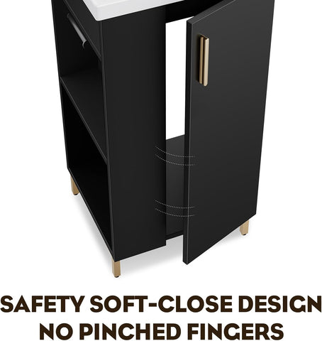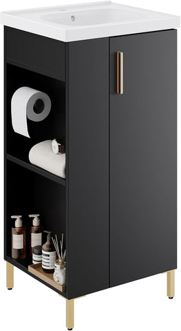 16-Inch Freestanding Bathroom Vanity with Sink – Black Cabinet with Ceramic Sink, Soft-Close Door and Side Storage