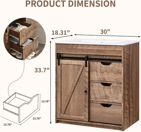 Overall dimension 30" W x 18.31" D x 33.7" H. Sink dimension 19.1" W x 10.6" D. Bathroom vanity with sink is made of quality MDF. Bathroom vanity features a wood grain finish with a subtle texture that adds elegance and modern farmhouse style. Bathroom vanities are made to last, suitable for any bathroom.