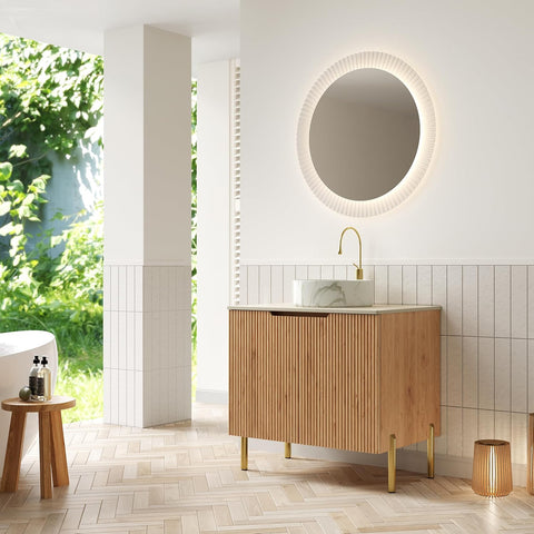 30-Inch Bathroom Vanity with Sink, Freestanding Modern Cabinet with Ceramic Basin, Soft-Closing Double Doors, Travertine-Pattern Sintered Stone Countertop, Natural Wood Finish