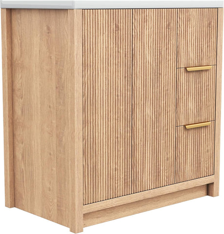 31.5-Inch Fluted Bathroom Vanity with Ceramic Sink – Modern Freestanding Cabinet with 2 Drawers, Natural Oak