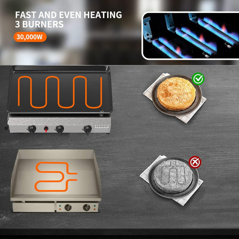 - 🍖 Even Heating & Controllable Zones: 3 independently controlled stainless-steel burners (10,000 BTU each, total 30,000 BTU) for versatile cooking. Easily create different heat regions on the griddle for multi-tasking your meal.