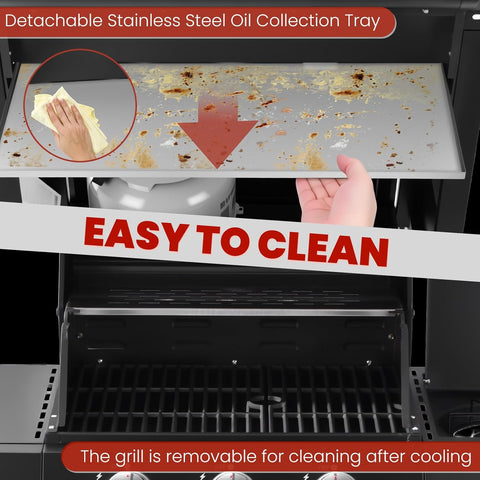 • Roll, Lock, Grill Anywhere: Integrated propane tank holder secures tank; 4 x 3” swivel casters with locking brakes for easy mobility; slide-out drip pan catches grease for mess-free cleanup.