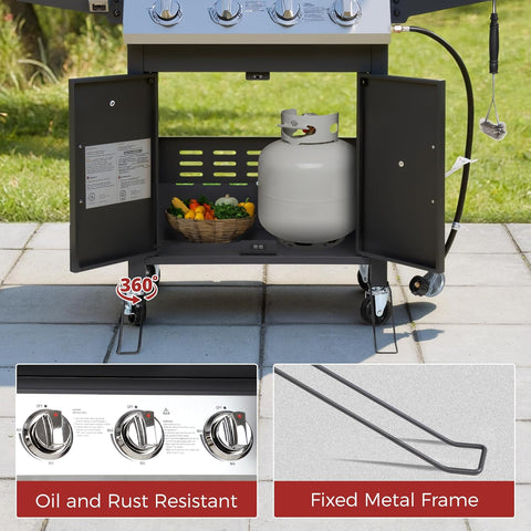 • New Design: Two lockable wheels for stability while grilling. Foldable side tables save space, and built-in spice rack keeps your grilling area organized.