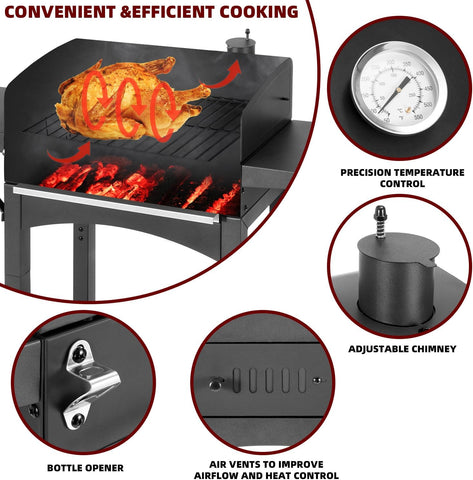 Charcoal BBQ Grill with 2 Side Tables, 343 Sq. In. Cooking Area, Smoker for Outdoor Backyard, Camping, Picnics, and Beach BBQs