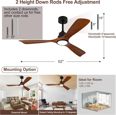 Upgrade your space with our outdoor ceiling fan featuring unique and durable blades crafted from high-quality natural walnut wood. The solid wood construction not only adds a touch of elegance but also ensures long-lasting durability. Perfect for covered outdoor spaces like patios and porches, as well as indoor areas such as bedrooms, living rooms, offices, farmhouses, and dining rooms, this wood ceiling fan combines style and functionality to enhance any room.